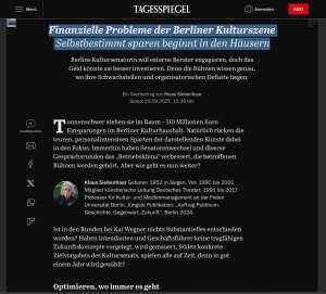 Klaus Siebenhaar: Finanzielle Probleme der Berliner Kulturszene: Selbstbestimmt sparen beginnt in den Häusern. Tagesspiegel, 29.05.2025 (Find the article here!)